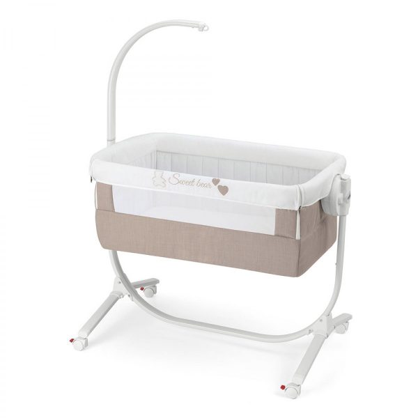 La parte superiore della culla vera e propria può assumere sia una posizione statica che una posizione basculante. Questa seconda si “attiva” per mezzo dell’estrazione di un perno che la tiene ferma, in modo tale da poterla lasciare libera di oscillare.
